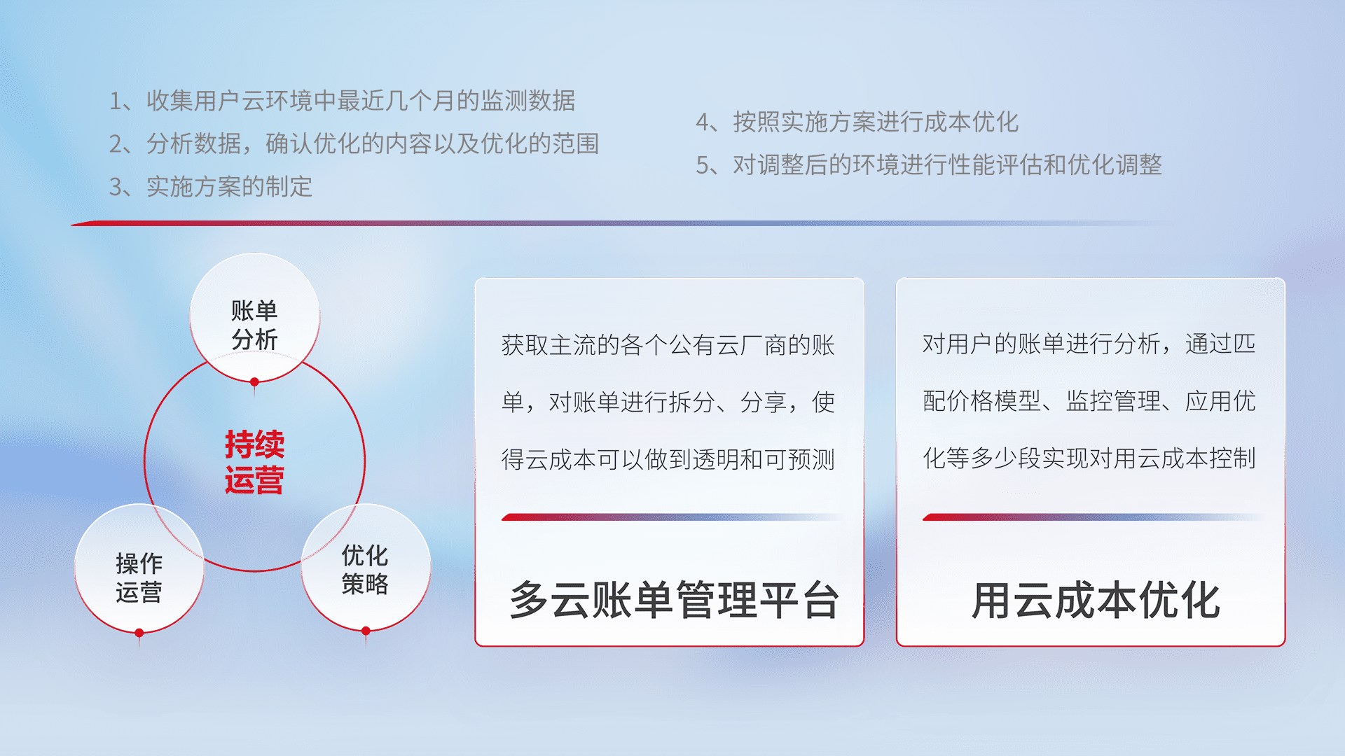 通过多云纳管,,,以统一的资源数据模型把客户的云资源进行抽象和封装,,,进而实现对多云资源的统一操作,,保障云资源管理的可靠性、、稳定性与可用性。。量身定制化运维内容,,,配置、、、开发运维、、补丁管理、、备份、、、监控、、、、认证和访问管理、、、审计和日常巡检等,,,保障在用云过程中的可靠度,,,,稳定度以及高可用率。。。。