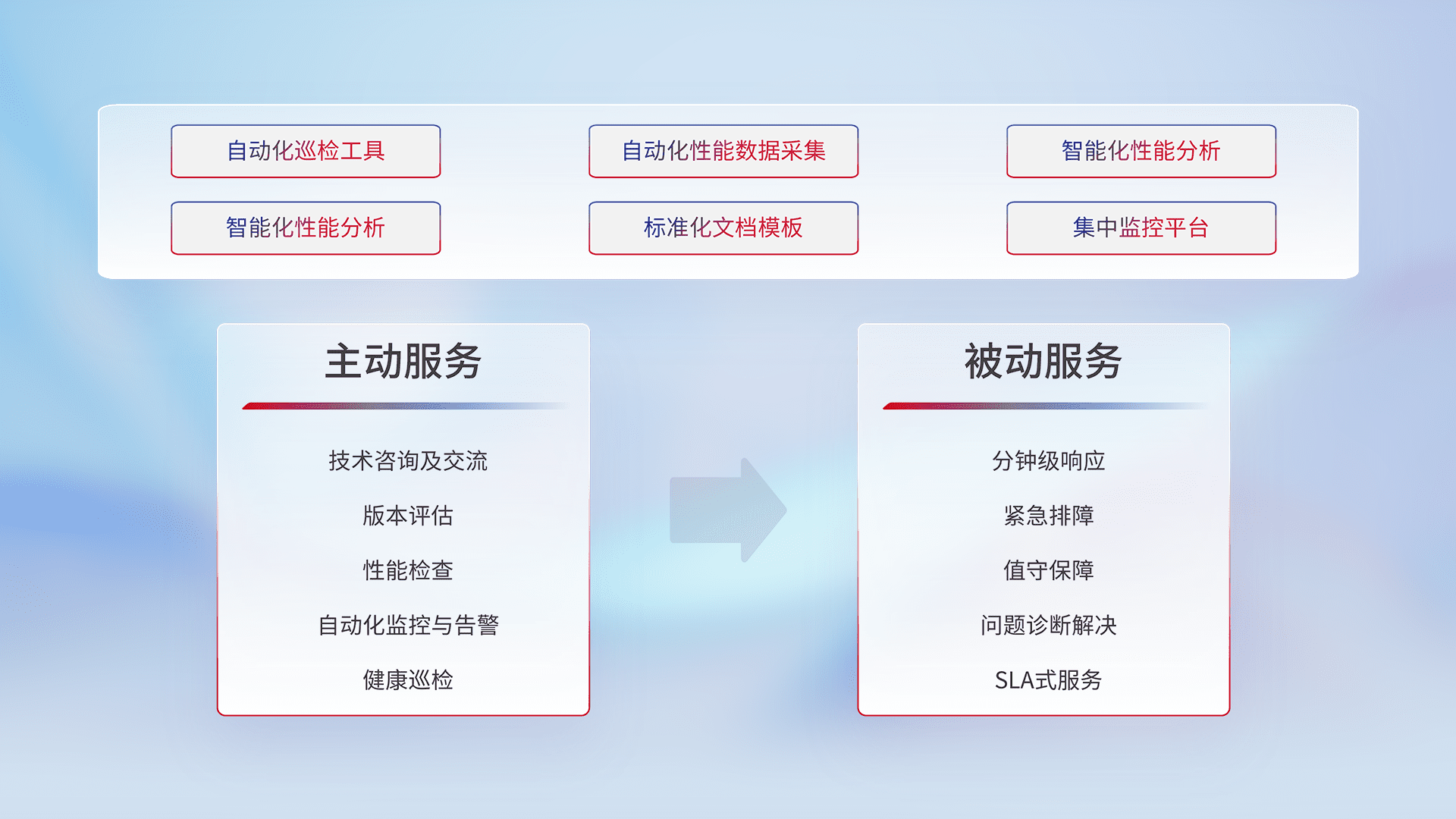 智能化工具和标准化文档,,,,保障服务质量,,,,提供主动服务(包含技术咨询、、、版本评估、、、、性能检查、、、、自动化监控与告警、、、、健康巡检)和被动服务包含(分钟级响应、、紧急排障、、、值守保障、、、、问题诊断解决、、、SLA服务)。。。。